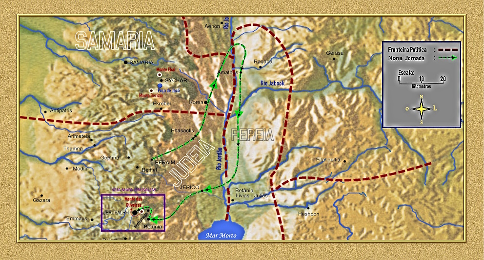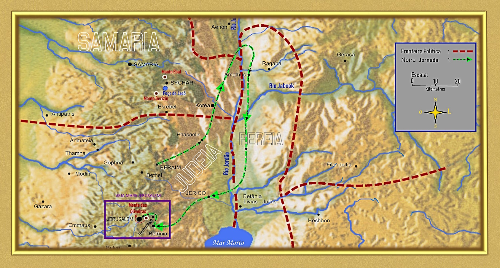 - Esta foi a ultima jornada de Nosso Senhor Jesus. Ele e seus Apóstolos partem de Efraim e vai para o norte da Samaria, depois para a fronteira da Galileia e Pereia e desce ate o sul da Pereia cruzando o Rio Jordão em direção à cidade de Jerico, depois ate Betânia próxima ao Monte das Oliveiras, Bethphage e finalmente a Jerusalém. Durante esta jornada missionaria, Nosso Senhor Jesus: