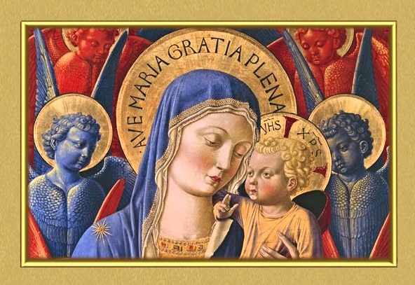 - Cheia de Graça ( Gratia plena ). Bem-aventurada (Beatíssima ou Beata) – Este titulo é em referencia a passagem bíblica onde o anjo Gabriel saúda Maria: Lucas 1:28 .