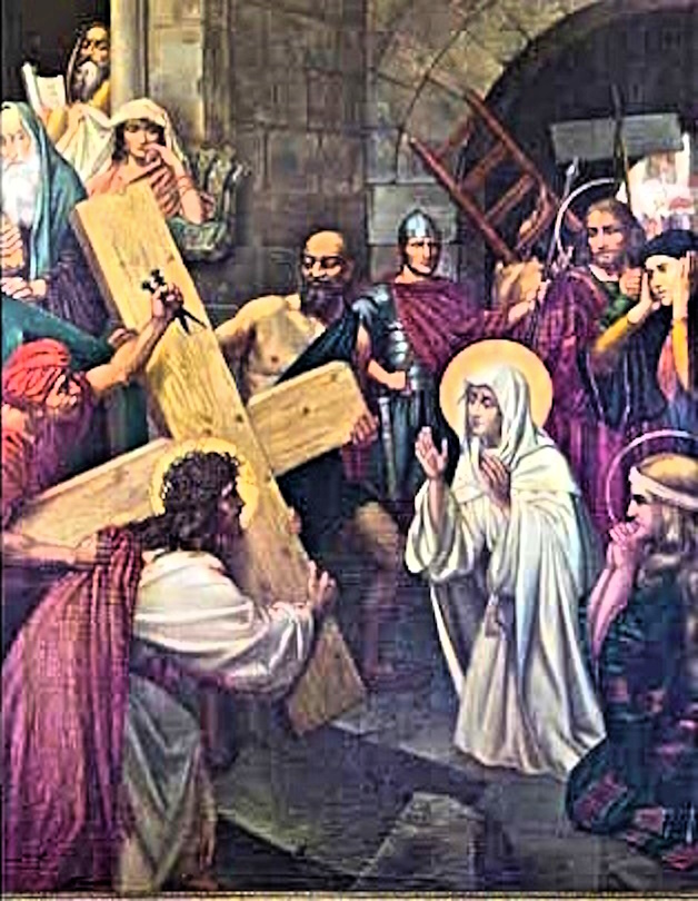 A amorosa Bem-aventurada Maria, encontra seu Amado Filho carregando sobre a cabeça uma coroa de espinhos e uma pesada Cruz nas costas. Seu sangue escorria pelo seu rosto e pelas dilacerações em seu corpo, provocadas pelos açoites e arduamente caminhava em direção ao Calvário. Ouvindo escárnios, maldiçoes e recebendo golpes que lhe provocaram inúmeras contusões. Dor inexplicável, sofrimento imensurável, uma tristeza absoluta, um coração cruelmente ferido, lagrimas e soluços naquela cena tão brutal vistas pelos olhos de uma tão Amorosa Mãe, onde o maior tesouro é seu amado Jesus.